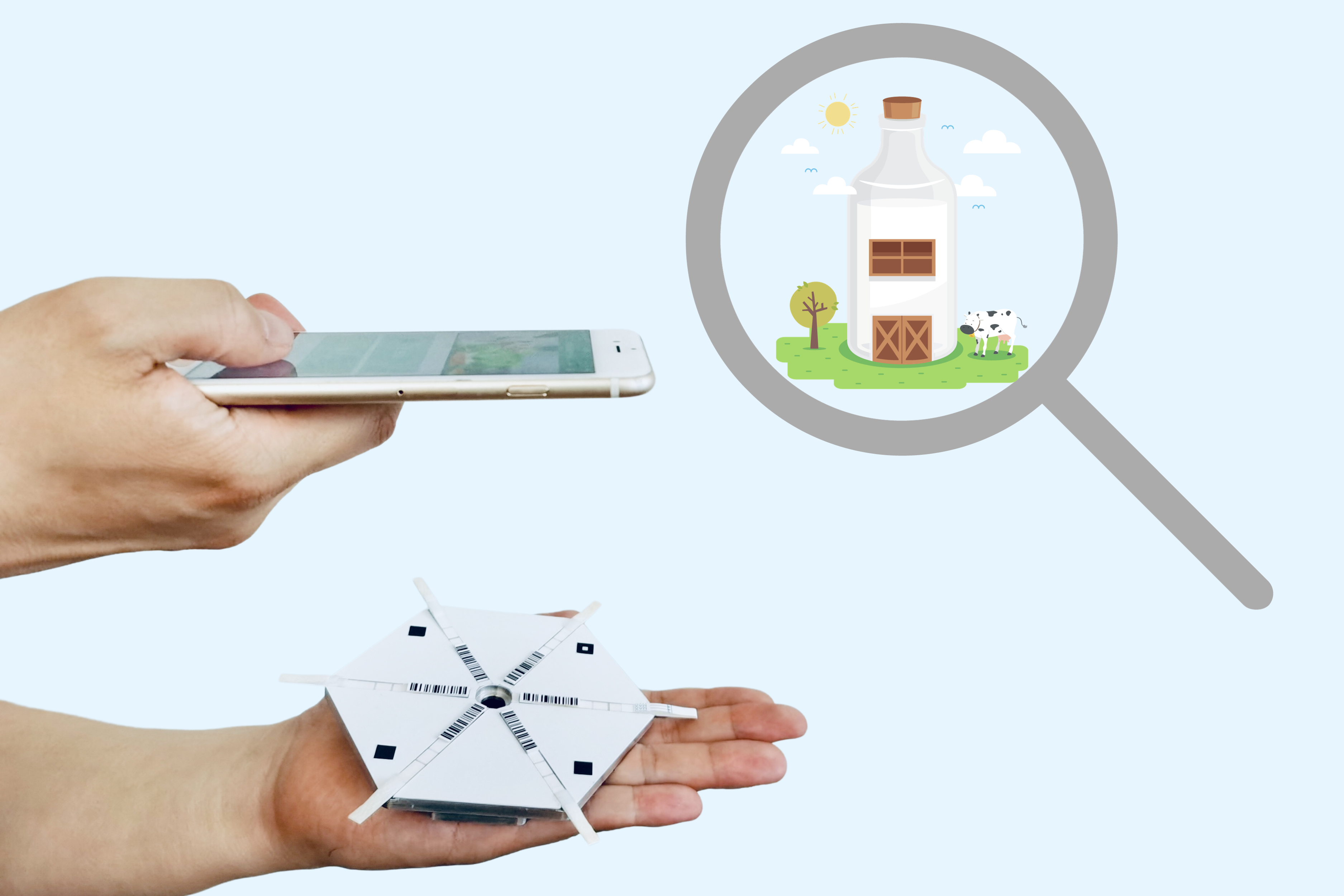 产品集成了半抗原合成、抗体制备、条形码标记免疫层析试纸条及其标准化、多通道阵列托盘、智能图像识别算法和大数据技术,通过开发的微信小程序拍照,5分钟完成农药残留等污染物、15分钟完成病毒等多种目标物的同时检测,检测结果直接显示在手机上。