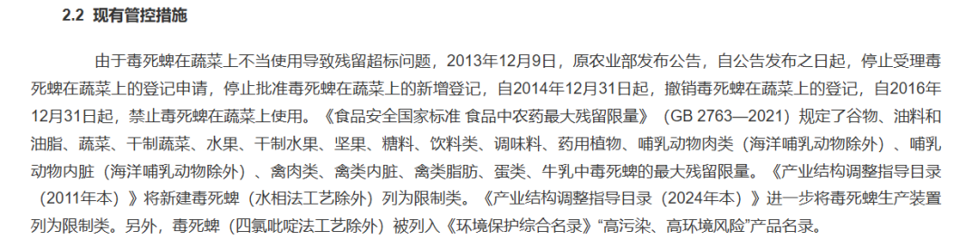毒死蜱是一种广谱性有机磷杀虫剂,《毒死蜱全球管控进展和我国加强毒死蜱管控的对策建议》[1]一文中概述了毒死蜱的现有管控措施,明确表明禁止在蔬菜上使用。