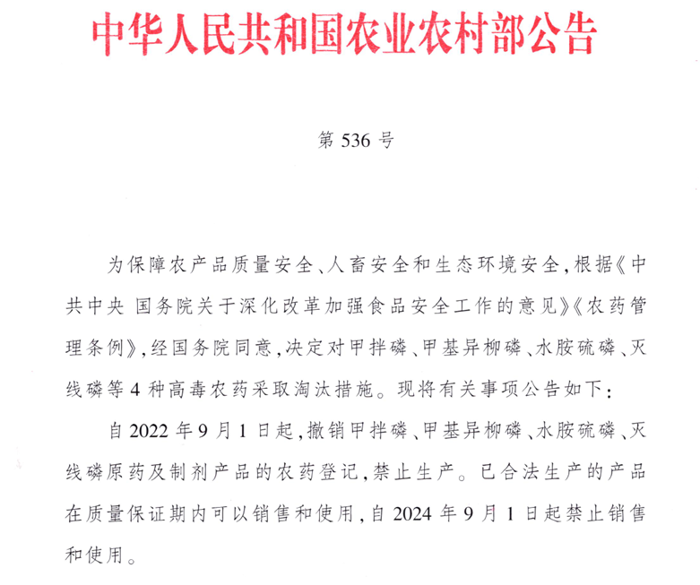 甲拌磷是一种高毒、高效、广谱的内吸性杀虫杀螨剂,根据《中华人民共和国农业农村部公告第536号》规定,已在2024年9月1日起禁止售卖和使用。